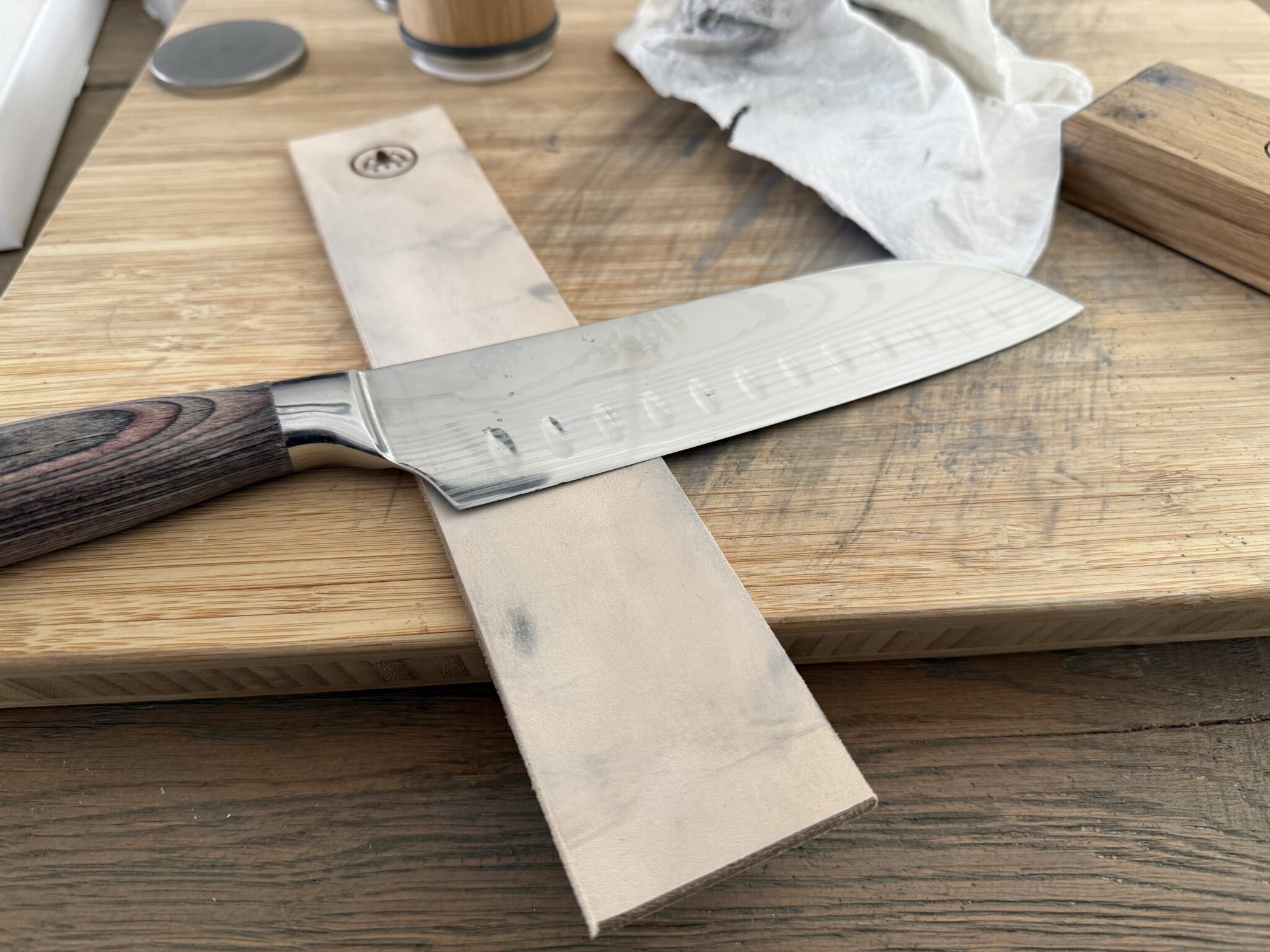 Als allerlaatste stap strijk je het mes een paar keer over de leren band. Dit verwijdert de laatste restjes slijpsel en geeft de snede een mooie afwerking. Beide kanten gedaan en klaar is Kees. Dat is echt alles.