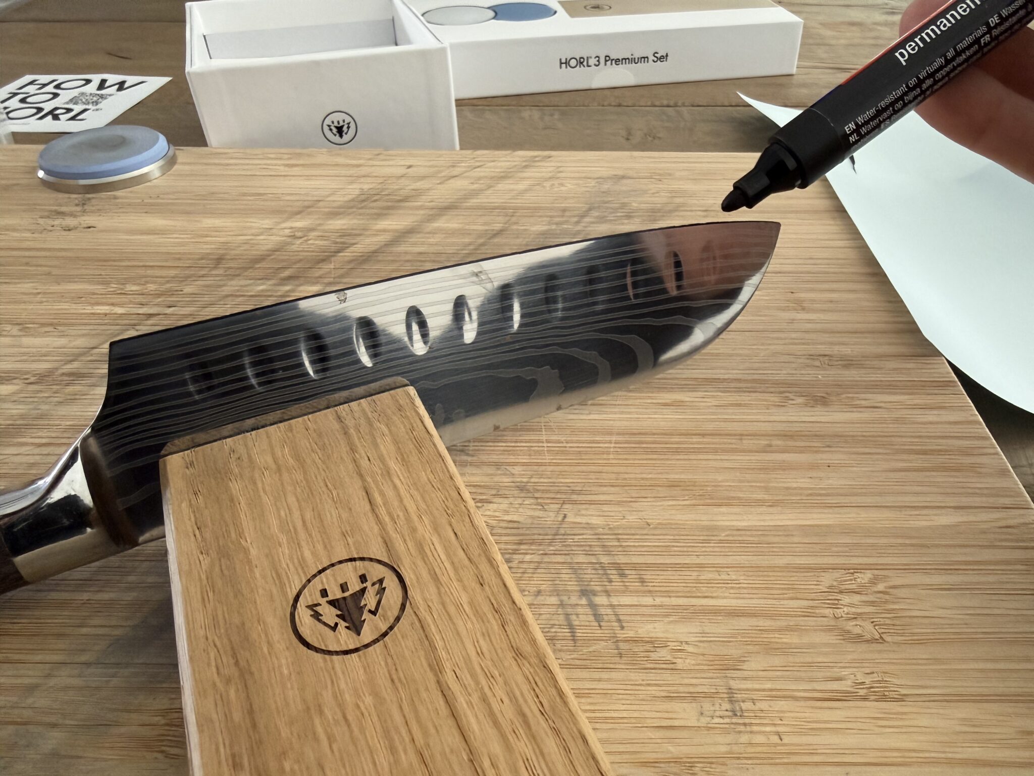 Een handige truc die ik toepas en die ook in de handleiding staat is het zetten van een streepje met een marker op de snede van je mes voordat je begint. Zo zie je tijdens het slijpen precies of je de juiste hoek aanhoudt en of je al voldoende hebt afgeslepen. Verdwijnt de streep gelijkmatig aan beide kanten? Dan zit je goed.