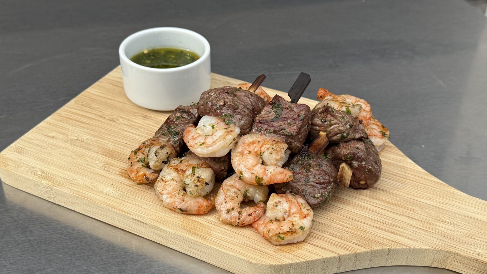 Wat deze spiesjes zo goed maakt, is de balans tussen het vlees en de garnalen. De biefstuk zorgt voor een volle, diepe smaak terwijl de garnalen juist dat frisse en lichtzoete toevoegen. Het is wel belangrijk dat je rekening houdt met de gaartijd van beide ingrediënten. Garnalen zijn namelijk veel sneller gaar dan rundvlees. Daarom snijden we de biefstuk bewust in iets kleinere blokjes (ongeveer 2 cm). Zo voorkom je dat je garnalen perfect zijn, maar je vlees nog te rauw is.