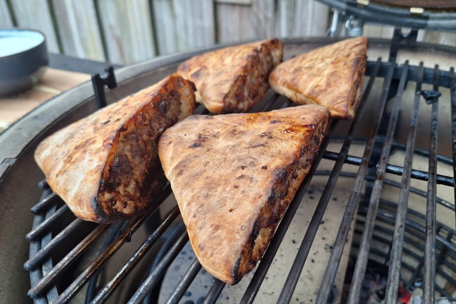 We grillen de gevulde pita's eerst op het directe gedeelte boven de kolen op 200 graden Celsius totdat de gehakt kant mooi bruin is.