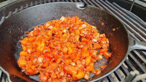 We steken nu de barbecue aan welke we klaarmaken voor directe bereiding. We gaan voor een koepeltemperatuur van 150 graden Celsius. Als de barbecue deze temperatuur heeft bereikt zetten we de skillet erop en laten we deze op temperatuur komen. Vervolgens doen we de zonnebloemolie in de pan en fruiten we de ui aan totdat deze glazig wordt. We persen nu de knoflook uit en voegen dit samen met de paprika blokjes toe. Laat dit 2-3 minuten bakken.