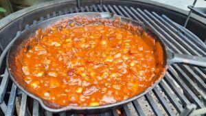 Vervolgens voegen we het blik met tomatenblokjes toe en laten dit geheel zo'n 10 minuten zachtjes sudderen. Na deze 10 minuten voeg je de bonenmix met mais toe en roer je dit goed door. De skillet mag nu van de barbecue af waarna je chili sin carne klaar is! Je mag dit nu mixen met de gekookte rijst totdat het een mooi geheel wordt.